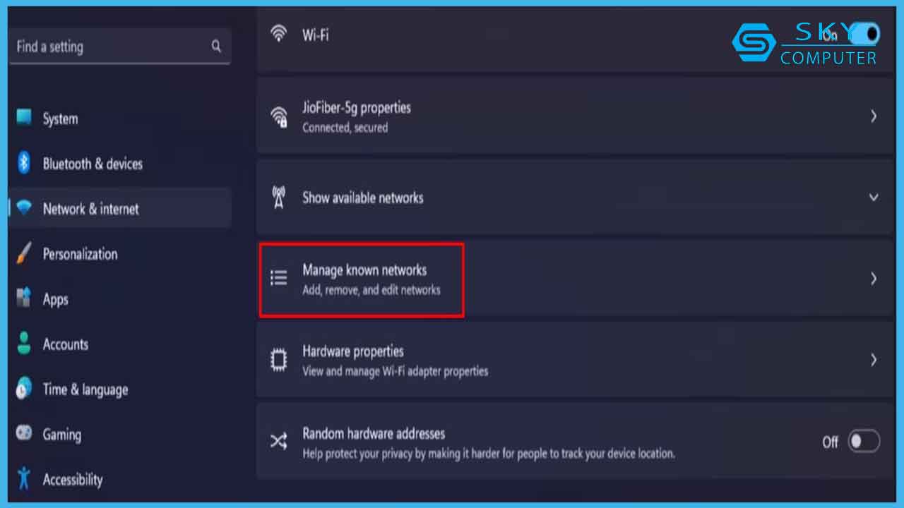 - Chọn tùy chọn Manage known networks (Quản lý mạng đã biết)