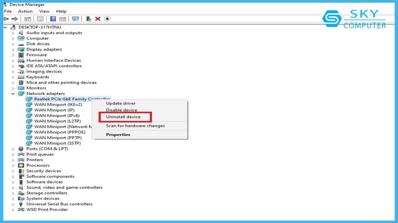 - Nhấp chuột phải vào bộ điều hợp mạng của bạn và chọn tùy chọn Uninstall device (Gỡ cài đặt thiết bị)