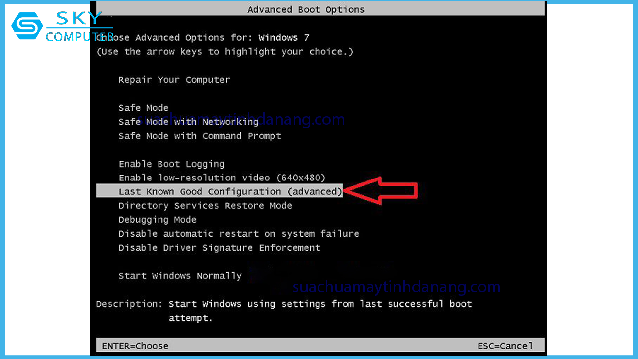 Đầu tiên, bạn khởi động máy với chế độ Safe Mode. khi xuất hiện bảng Advanced Boot Options, bạn nhấn chọn Last Known Good Configuration (advanced).