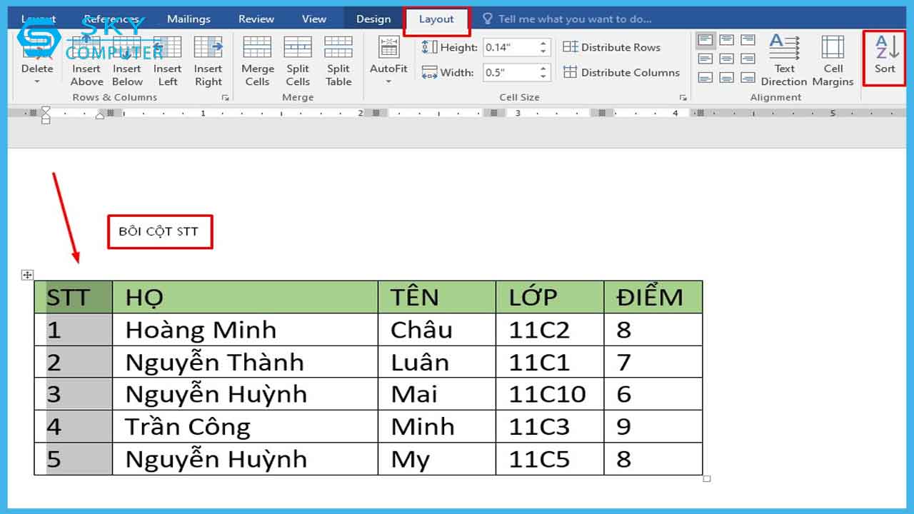Bước 1: Thực hiện bôi đen cột STT trong bảng dữ liệu cần sắp xếp. Chọn Layout => chọn Sort.