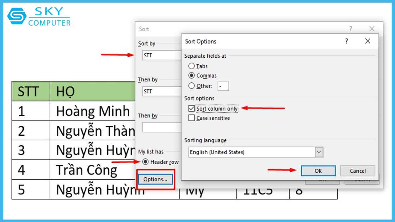 - Chọn vào Options => tích chọn Sort Column Only và nhấn OK.