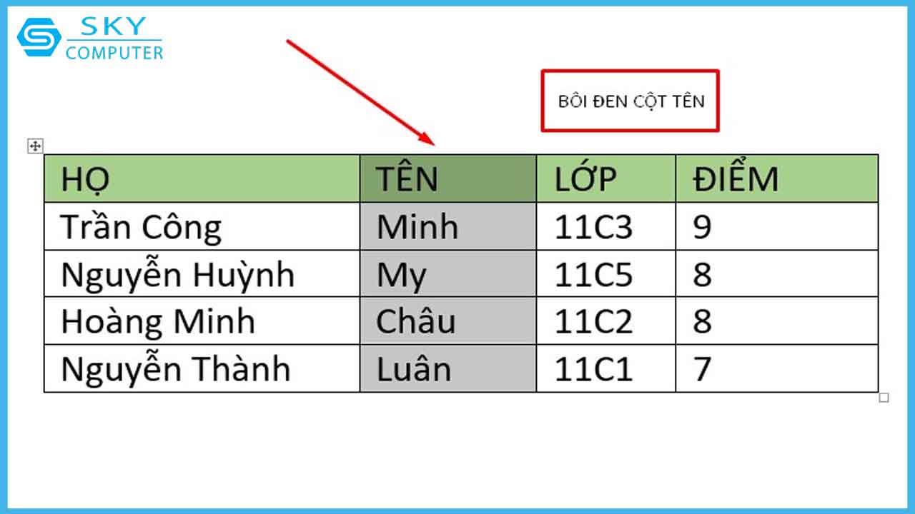 Bước 1: Bạn mở file Word chứa dữ liệu cần sắp xếp. Sau đó bôi đen cột chứa Tên.
