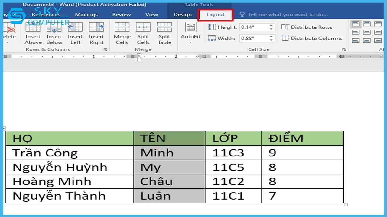 Bước 1: Tương tự bạn mở file dữ liệu cần sắp xếp. Sau đó, bôi đen cả cột Họ và Tên trong bảng dữ liệu. Nhấn tab Layout và chọn Sort trong Word.
