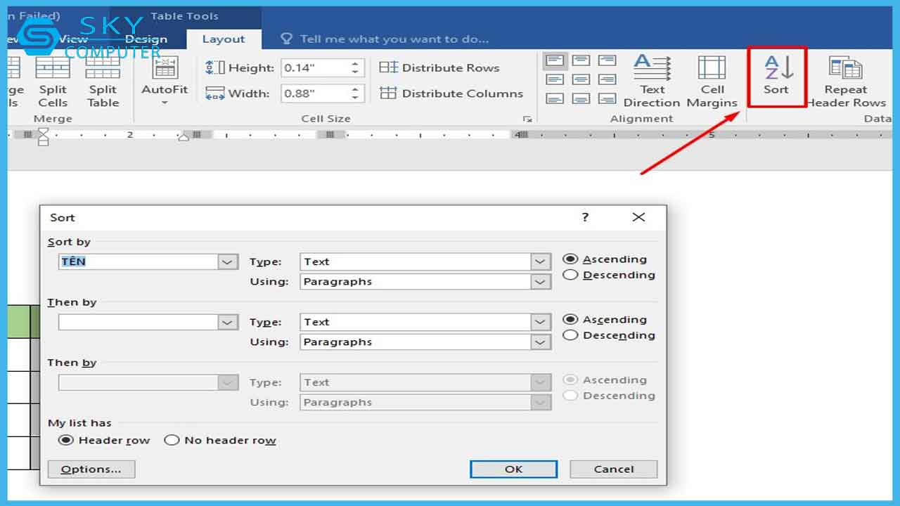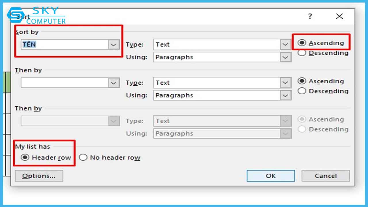 Bước 3: Trong hộp thoại Sort, bạn chọn Tên ở ô Sort by (sắp xếp thứ tự theo Tên) và chọn Ascending (sắp xếp theo thứ tự tăng dần từ A đến Z). Cuối cùng, bạn tích chọn vào ô Header Row. Như vậy Word sẽ biết bảng có hàng đầu tiên là hàng tiêu đề, Word sẽ không sắp xếp hàng này.