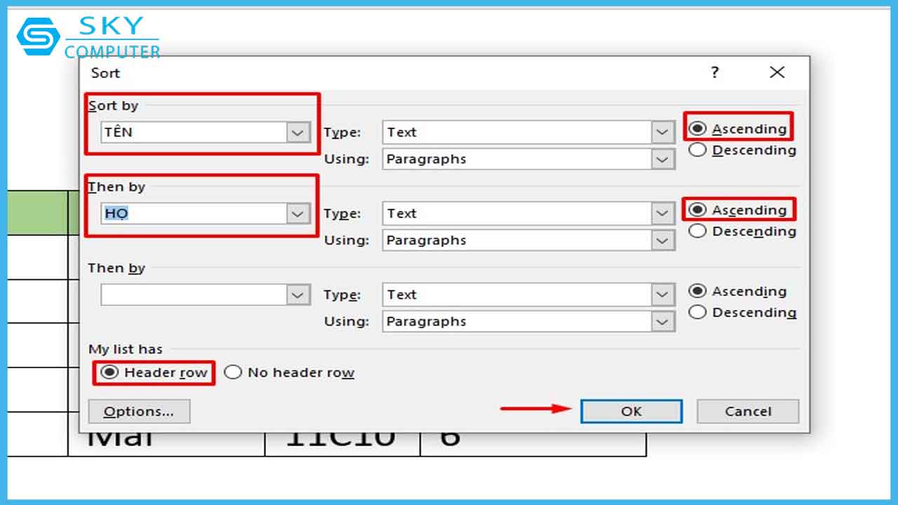 Bước 2: Ở mục Sort by chọn cột Tên => Mục Then by chọn cột Họ => Chọn Header row trong My list has để không sắp xếp hàng tiêu đề trong bảng dữ liệu và nhấn OK.