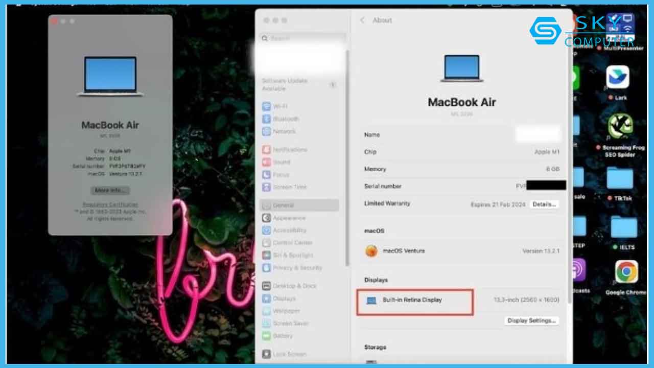 Bước 2: Sau đó, trong bảng điều khiển bạn hãy chọn mục Tổng quan. Trong bảng thông tin hiển thị ở mục Displays, bạn sẽ thấy dòng Built-in Retina LCD nếu máy của bạn trang bị màn hình Retina.