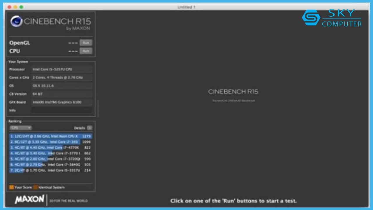 Ngoài những cách trên, người dùng Macbook có thể kiểm tra chất lượng xuất hình của GPU bằng Cinebench R15. Đây là công cụ đánh giá hiệu năng của card đồ họa sử dụng OpenGL. Phần mềm này hoàn toàn miễn phí, giao diện khá thân thiện và dễ dàng thao tác. Bạn nên test card màn hình khi màn hình MacBook bị giật nhấp nháy thỉnh thoảng hoặc liên tục.
