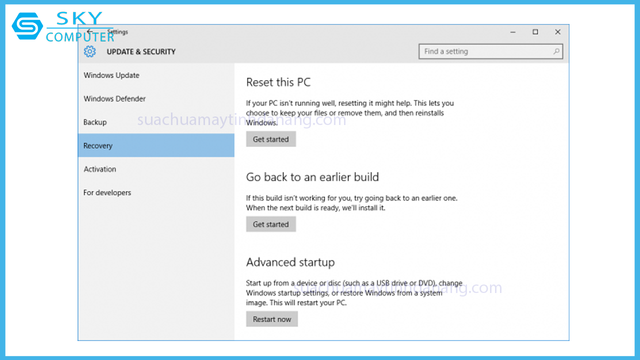 Bước 4: Bạn tiếp tục click chuột vào Get Started nằm ngay trong mục Reset this PC. Nếu chưa rõ, bạn có thể kéo lên và nhìn lại hình ảnh phía trên.