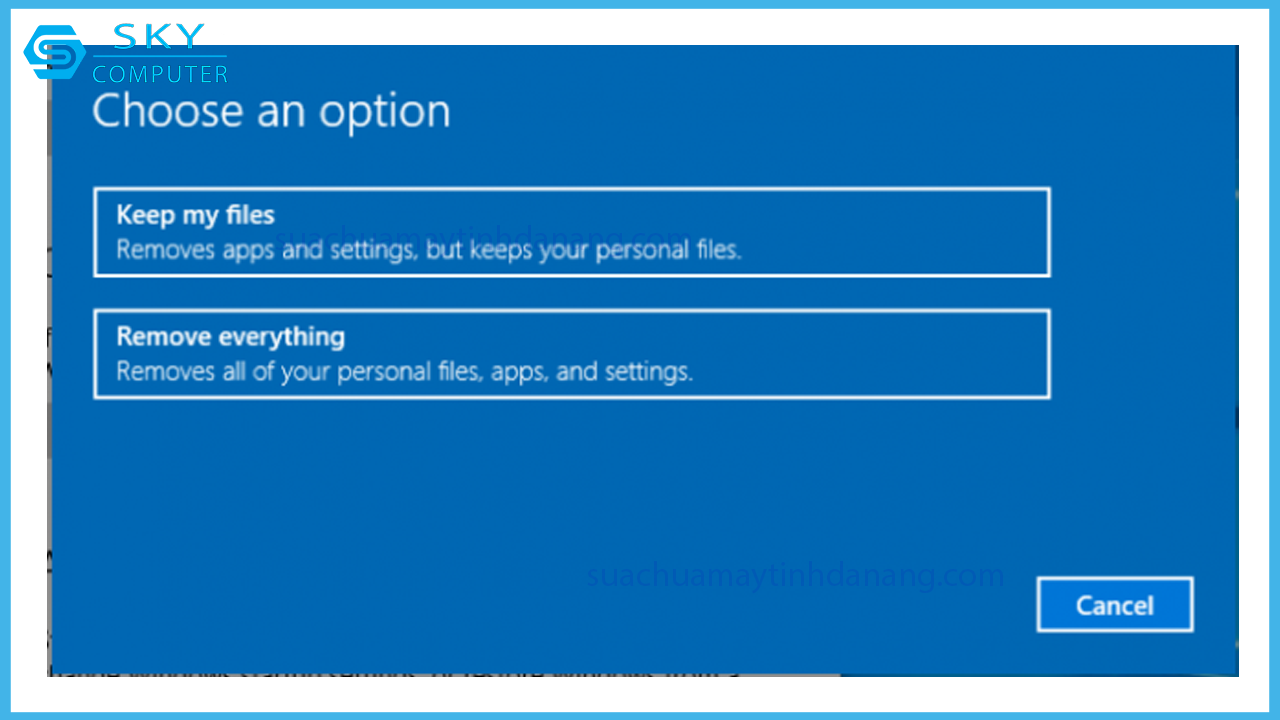 Bước 5: Bước này rất quan trọng vì sẽ quyết định Reset Windows dữ lại dữ liệu hay xóa sạch. Bạn nên nhớ phải nhấn chuột vào ô Keep my files để Reset Windows 10 không bị mất các dữ liệu cá nhân.