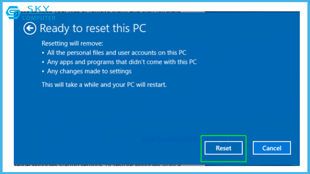 Bước 8: Dòng Ready to reset this PC xuất hiện trên màn hình. Lúc này, bạn chọn Reset để khởi động lại Windows 10.