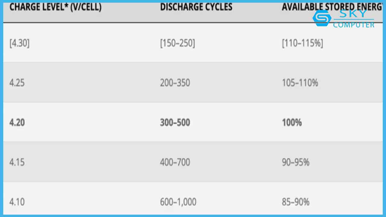 Pin lithium-ion có thể sạc tới 4,20 volt trên mỗi viên, tương đương 100% công suất. Với mức này, viên pin sẽ có tuổi thọ từ 300-500 chu kỳ xả. Do đó, sau mỗi lần sạc viên pin của bạn sẽ giảm đi 0.10V/cell và sẽ nhân đôi số chu kỳ xả cho đến khi nó đạt mức tối ưu là 3.90V/cell, với 2400-4000 chu kỳ xả. Nếu thật sự bạn rơi vào tình trạng này, máy của bạn chỉ có thể sạc được khoảng 60% so với khi còn mới. Và tất nhiên thời gian tiêu tốn dung lượng pin cũng sẽ nhanh hơn việc viên pin được sạc đầy.