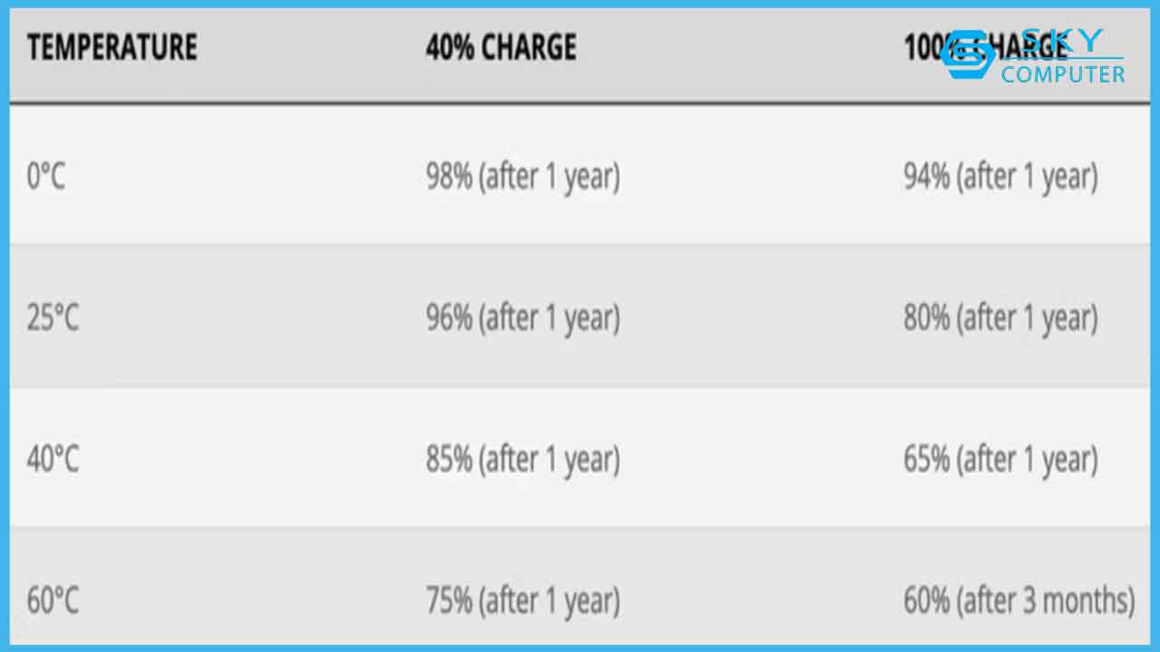 Và trong quá trình sử dụng máy tính, việc để nó ở nhiệt độ cao sẽ làm giảm đi tuổi thọ của viên pin. Nếu nhiệt độ của bạn đạt trên 30 độ C, viên pin của bạn sẽ bị rút ngắn tuổi thọ của pin. Và nếu bạn duy trì chiếc máy tính của mình trong nhiệt độ càng lâu thì tình trạng tụt dốc không phanh của pin sẽ không giảm. Theo như nghiên cứu của Đại học Battery, nếu bạn sạc pin được 40% ở nhiệt độ ở 40 độ C sẽ thấy dung lượng của nó giảm xuống 85% sau một năm. Có nghĩa là sau một năm đó, dù bạn đã sạc được 100% thì hiệu suất mà bạn nhận lại từ viên pin chỉ còn 85% so với ban đầu.