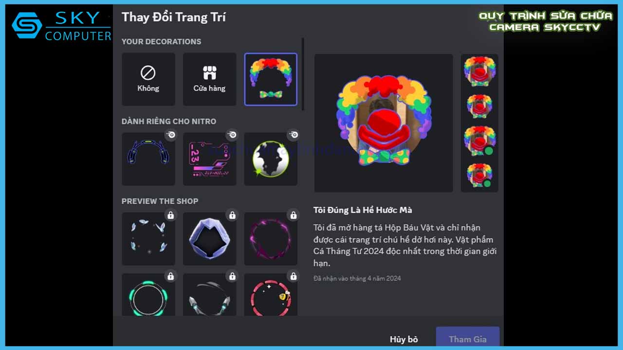 Tất nhiên, vì chỉ là một trò đùa ngày Cá Tháng Tư nên tất cả những vật phẩm bạn mở được đều không thể sử dụng và sẽ biến mất sau sự kiện. Tuy vậy, nếu bạn đủ kiên nhẫn và thu thập đủ 9 vật phẩm bạn sẽ được nhận 1 khung trang trí Avatar Hề để chứng nhận bạn đã bị Discord “troll” như thế nào. Bạn có thể sử dụng khung viền trang trí này trong một thời gian giới hạn.