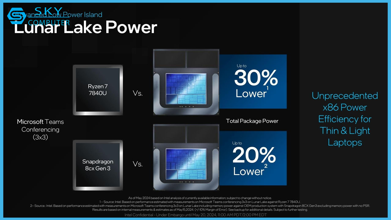 Ngoài ra, để khẳng định hiệu quả tiêu thụ điện năng của mình, Intel so sánh LNL tiêu thụ ít hơn 30% điện năng so với đối thủ x86 (Ryzen 7 7840U) và ít hơn 20% so với đối thủ ARM (Snapdragon 8cx Gen 3) khi cùng chạy Microsoft Team Conferencing (3×3). Điều này có thể không ngạc nhiên nếu LNL thực sự sử dụng các quy trình Intel 20A/TSMC N3, vì cả hai đối thủ đều dùng quy trình 5 nm, ít tiết kiệm điện hơn.