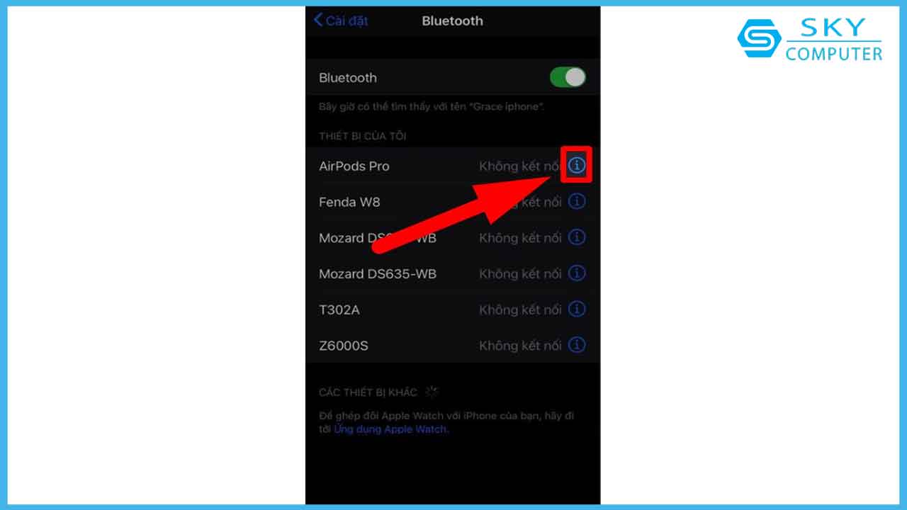 Đầu tiên bạn cần vào Bluetooth trên điện thoại của mình > nhấn vào thiết bị Airpod tại icon chứ “i” như hình.