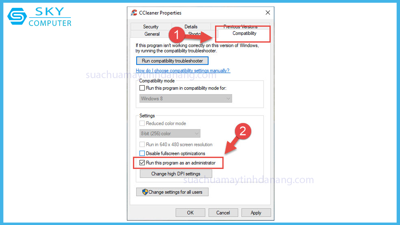 Bước 2: Trên tab Compatibility, tích vào ô trống “ Run this program as an administrator”. Và sau đó, nhấn nút Apply để thực hiện những thay đổi mới.