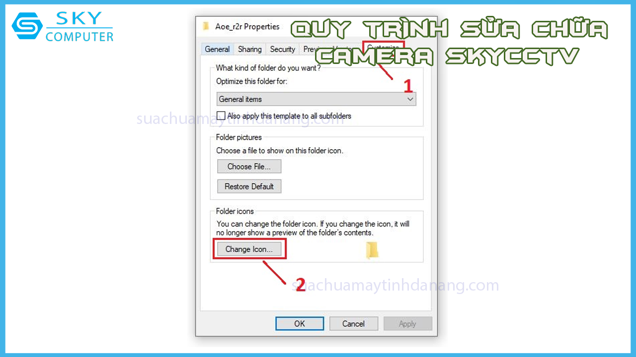 Bước 2: Ngay lập tức hộp thoại Properties sẽ xuất hiện. Bạn chọn tab Customize. Trong tab này, tìm và chọn Change Icon.