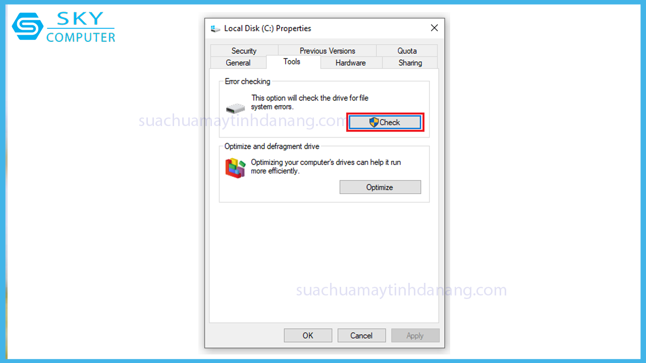 - Chuyển sang Tab Tools rồi nhấn check để kiểm tra ổ cứng.